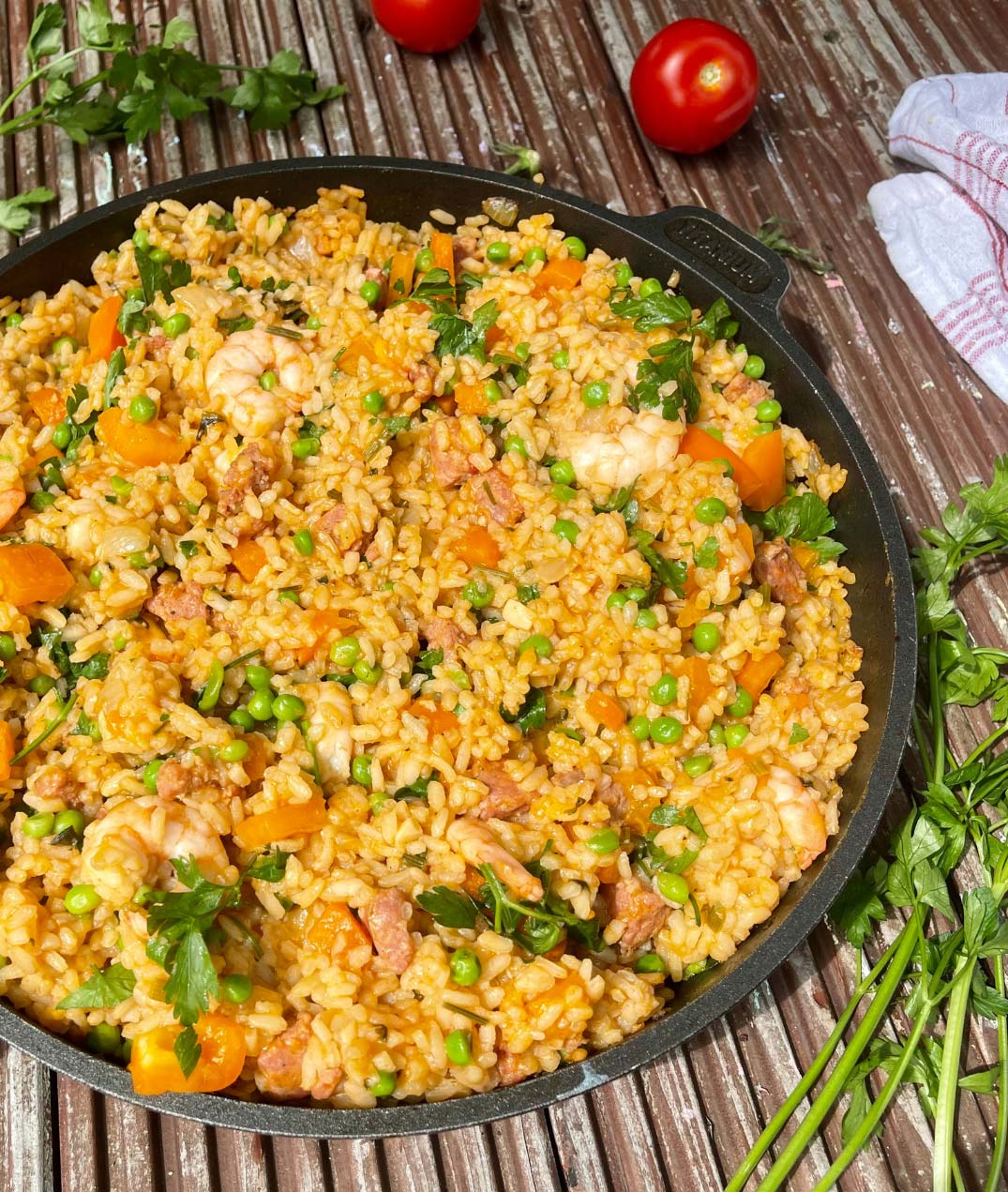 Einfaches Paella Rezept mit Garnelenschwänzen, Chorizo und buntem Gemüse. Aromatisch, mediterran und perfekt für 4–6 Personen. Ideal zum Nachkochen für gesellige Abende.