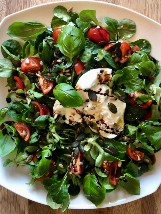 Dieses einfache und schnelle Feldsalat Rezept verbindet knackigen, frischen Feldsalat mit süßen Tomaten und cremigem Büffelmozzarella. Ein besonderes Dressing aus Himbeeressig und Kürbiskernöl sorgt für das nussige Aroma. Perfekt für alle, die einen leichten, gesunden Salat in nur 15 Minuten zubereiten möchten. Ideal als Snack, Beilage oder leichtes Essen – probiere es aus und genieße den frischen Geschmack!