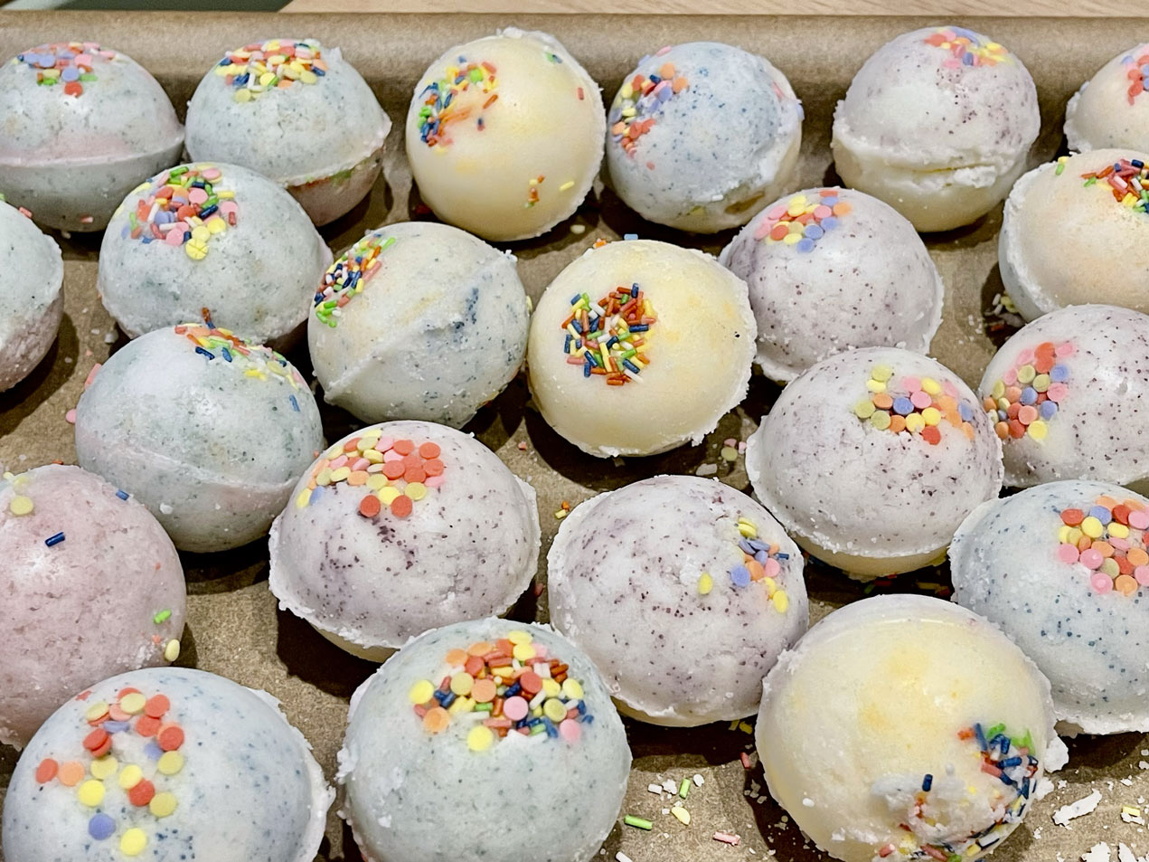 Selbstgemachte Badebomben machen sich wunderbar als kleines Geschenk: