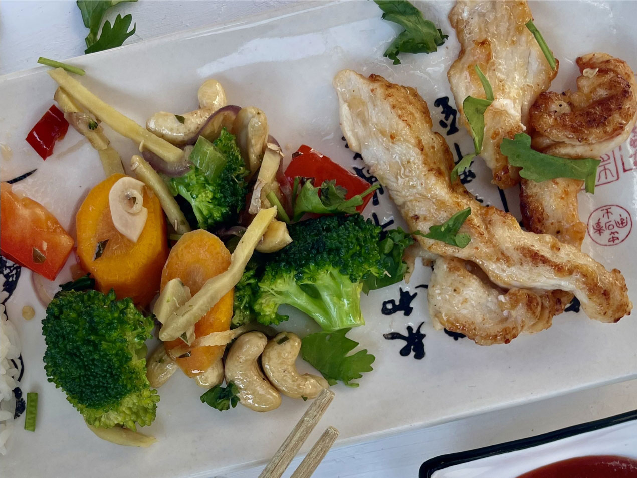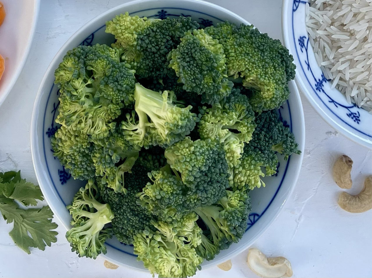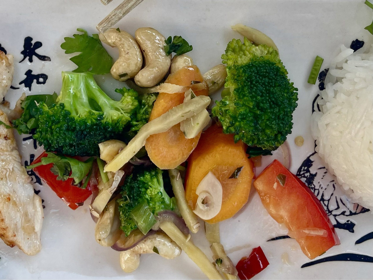 - Verteile den heißen Reis auf Teller. Gib das Asiatische Gemüse und das Huhn dazu. Bestreue alles mit den Cashewkernen und frischem Koriander. Serviere das Gericht direkt, solange das Gemüse noch schön bissfest ist.